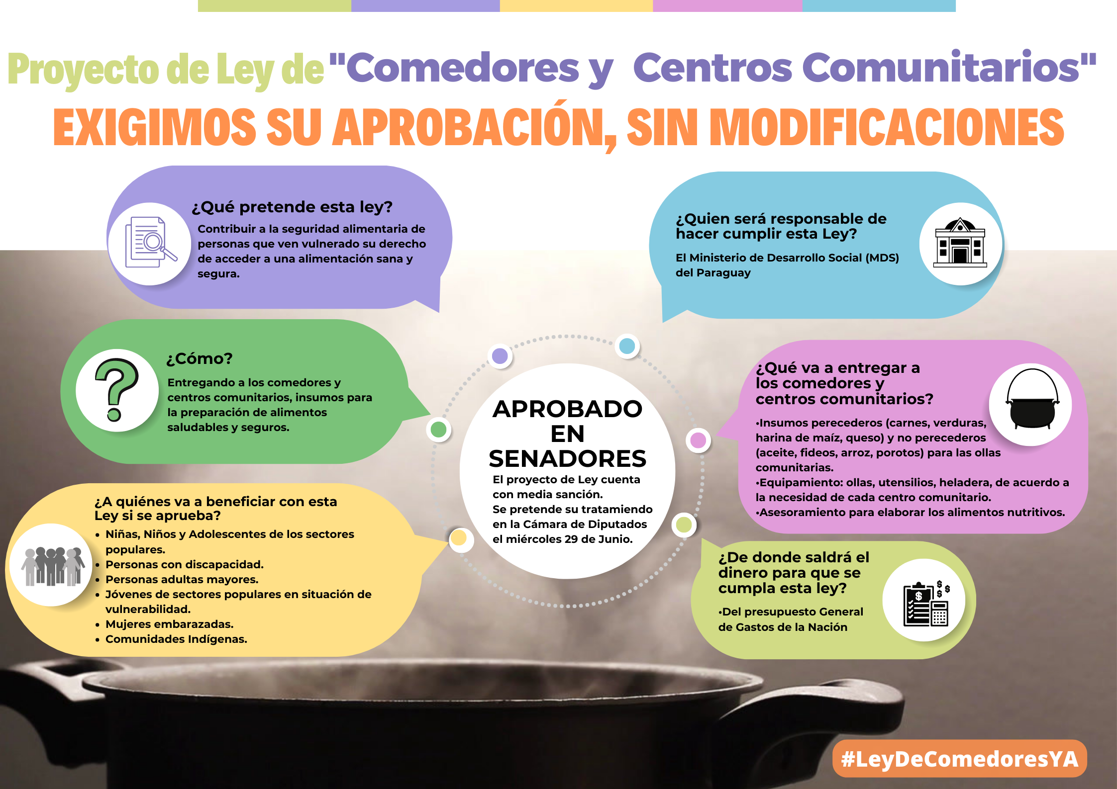 Las organizaciones de Niñas, Niños, Adolescentes, jóvenes y madres, nos conformamos en red y acordamos acciones de incidencia para que la Cámara de Diputados apruebe la LEY DE COMEDORES Y CENTROS COMUNITARIOS. En un principio, los Diputados tratarían esta Ley en sesión del miércoles 29 de junio.