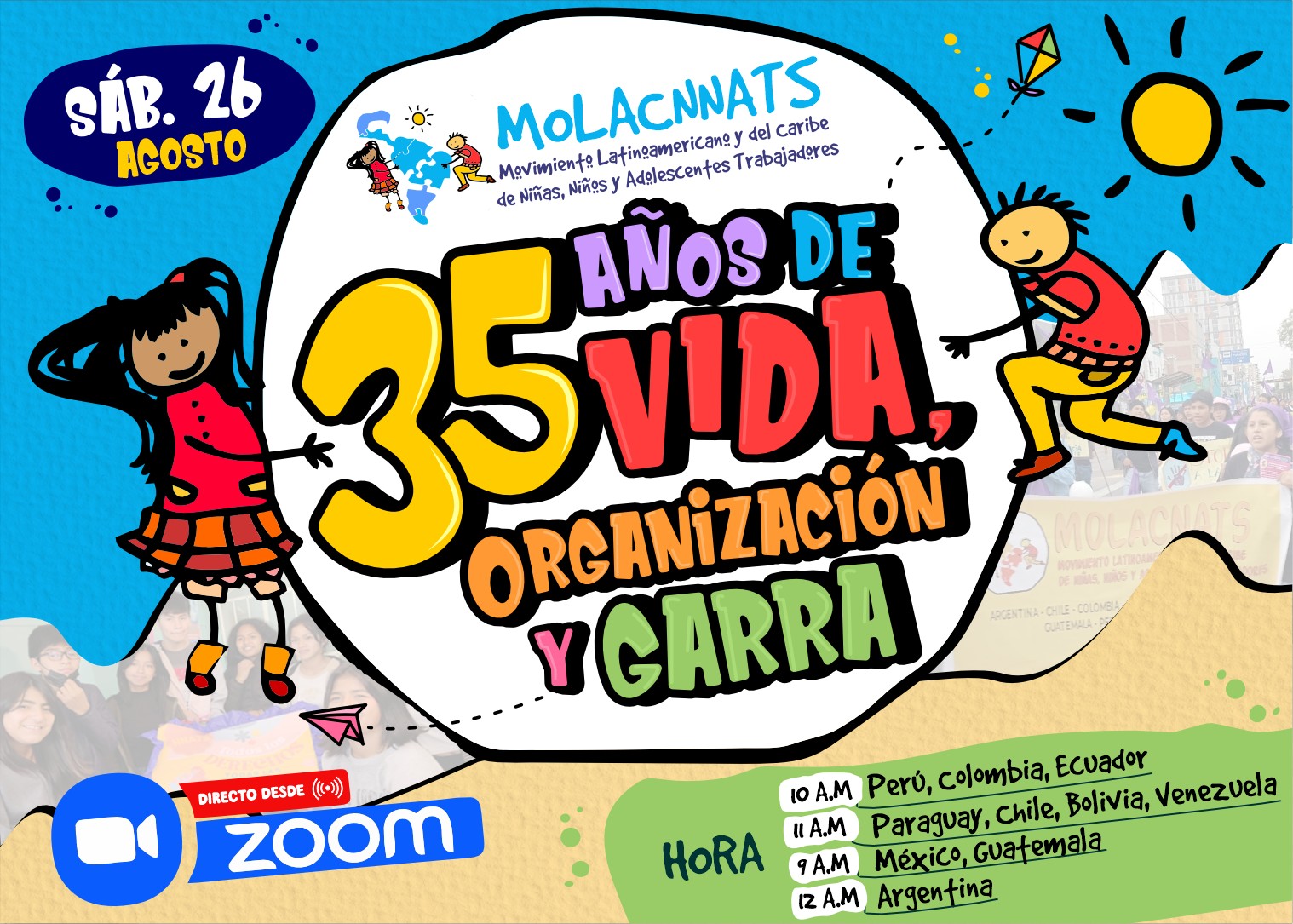 #INVITACIÓN ° Nuestro Movimiento Latinoamericano y del Caribe de Niñas, Niños y Adolescentes, Trabajadores – MOLACNNATS, hace extensiva la invitación para celebrar los primeros 35 años de vida, organización y garra defendiendo el trabajo digno como parte de nuestra cultura humana y el cumplimiento de los derechos de todas las infancias.